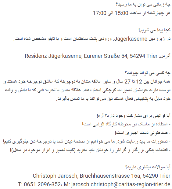 تیم کارگاه در پروژه "فلیکورک" این فرصت را به شما میدهد که خودتان، به تنهایی یا با دیگران، دوچرخه خود را تعمیر کنید. ما به شما نشان خواهیم داد که چگونه به سرعت نقصهای ساده را تعمیر کنید. یاد خواهید گرفت که چگونه از ابزارهای ویژه به درستی استفاده کنید. ما خوشحال میشویم ٬ که به شما نکات و کمک هایی ٬ برای دست به کار شدنتان ارائه دهیم.